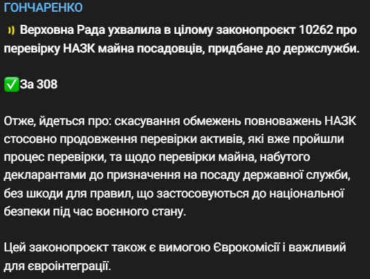 Об этом сообщает народный депутат Алексей Гончаренко в своём телеграм-канале.