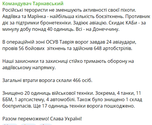 Также Тарнавский сообщил, что общие потери РФ составили 466 человек.