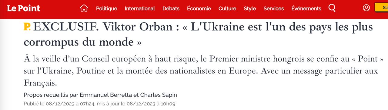 После их встречи премьер Венгрии заявил изданию Le Point, что ЕС "не готов и не может" принять Украину по ряду причин. В частности, назвал Украину "одной из самых коррумпированных стран мира".