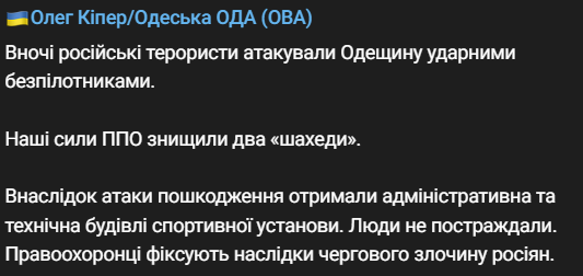 "Ночью российские террористы атаковали Одесскую область ударными беспилотниками. Наши силы ПВО уничтожили два "Шахеда", - написал он.