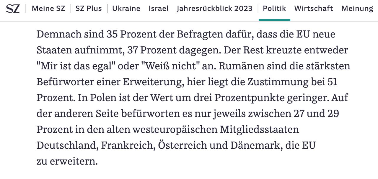 В Западной Европе поддержка расширения ЕС ниже - в Германии, Франции, Австрии и Дании за это высказались только 27-29% опрошенных. Из них вступление конкретно Украины поддержали 50% в Дании, 37% в Германии, около 30% во Франции и Австрии.