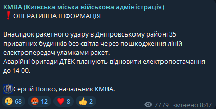 "В результате ракетного удара в Днепровском районе 35 частных домов без света из-за повреждений линий электропередач обломками ракет. Аварийные бригады ДТЭК планируют возобновить электроснабжение до 14-00" - говорится в сообщении.