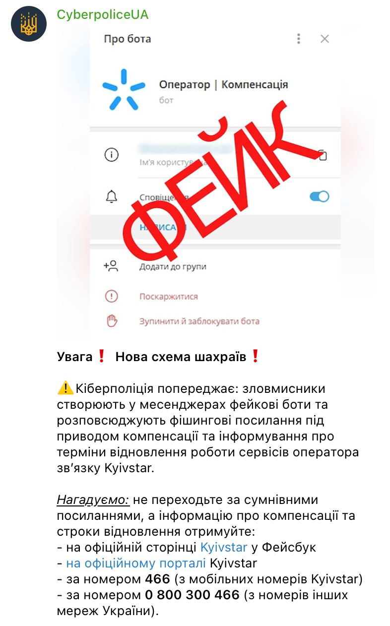 Злоумышленники создают в мессенджерах фейковые боты и распространяют фишинговые ссылки под предлогом компенсации и информирования о сроках возобновления работы сервисов оператора.