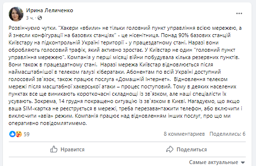 В Фейсбуке она развеяла слухи о том, что "хакеры "убили" не только главный пункт управления всей сетью, но и снесли конфигурации на базовых станциях".