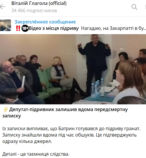 Напомним, сегодня на Закарпатье депутат во время сессии Керецковского сельсовета (Мукачевский район) взорвал гранаты. Пострадали 26 человек. Сначала сообщалось, что подрывник погиб. Но затем в МВД уточнили, что его пытаются реанимировать. Как написал журналист Виталий Глагола, у Батрина оказалось несмертельное ранение в живот.