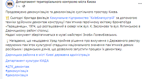 В субботу, 16 декабря, в Киеве КП "Киевблагоустройство" демонтировали памятник героическому экипажу бронепоезда "Таращанец".