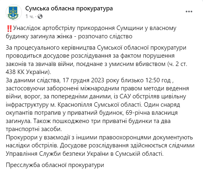 "По данным следствия, 17 декабря 2023 около 12:50, применяя запрещенные международным правом методы ведения войны, враг, по предварительным данным, из САУ обстрелял гражданскую инфраструктуру г. Краснополье Сумской области. Один снаряд оккупантов попал в частный дом, 69-летняя владелица погибла. Также повреждены три частных дома и два транспортных средства", - говорится в сообщении.