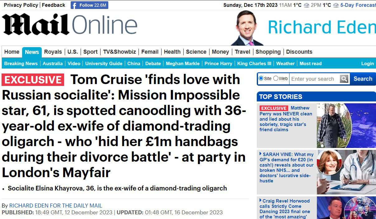 61-летний голливудский киноактер Том Круз был замечен с дочерью бывшего депутата Госдумы РФ из Татарстана от "Единой России", светской львицей Эльсиной Хайровой.