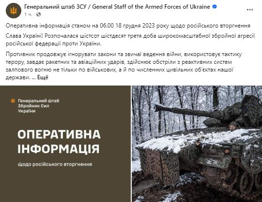 Война в Украине идет уже 663-й день. Мы следим за последними новостями и ключевыми событиями 18 декабря 2023 года в обновляемом онлайне.
