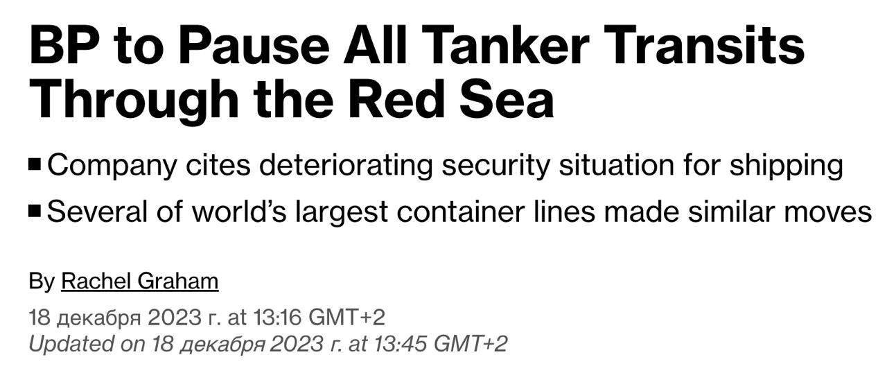 "В свете ухудшения ситуации с безопасностью судоходства в Красном море BP решила временно приостановить весь транзит через Красное море", — говорится в заявлении компании.