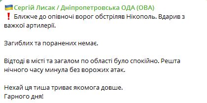 07.35 Около полуночи враг обстрелял Никополь Днепропетровской области из тяжелой артиллерии.