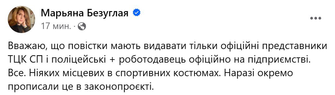 "Считаю, что повестки должны выдавать только официальные представители ТЦК СП и полицейские + работодатель официально на предприятии. Все. Никаких местных в спортивных костюмах. Отдельно прописали это в законопроекте", - написала Безуглая.