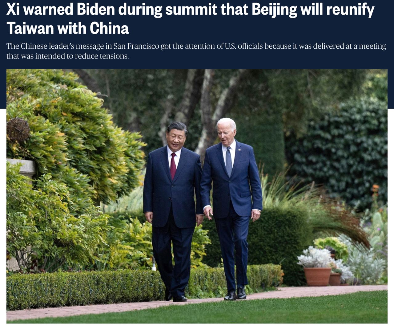 Председатель КНР Си Цзиньпин прямо заявил президенту США Джо Байдену на их недавней встрече в Сан-Франциско, что Китай воссоединится с Тайванем, но "мирным путем, а не силой".
