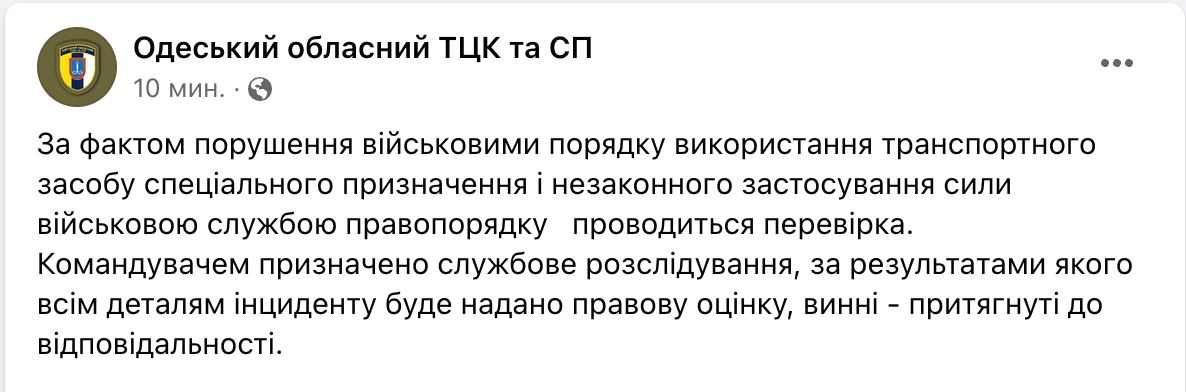 Вскоре после появления публикаций видео инцидента в соцсетях Одесский ТЦК сообщил, что начал служебную проверку эпизода. Расследование касается "нарушения военными порядка использования транспортного средства специального назначения и незаконного применения силы военной службой правопорядка".