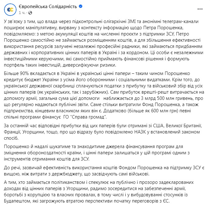 Как сказано в сообщении пресс-службы в Фейсбуке "Евросолидарности", деньги - это доходы от государственных и корпоративных ценных бумаг, приобретением которых занимаются инвестиционные управляющие, нанятые Порошенко.
