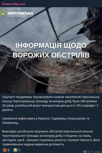 "В результате российских вражеских обстрелов Херсонской городской территориальной громады за минувшие сутки 3 человека, к сожалению, погибли, еще 8 - получили ранения различной степени тяжести. Всем травмированным оказана медицинская помощь", - пишет Мрочко.
