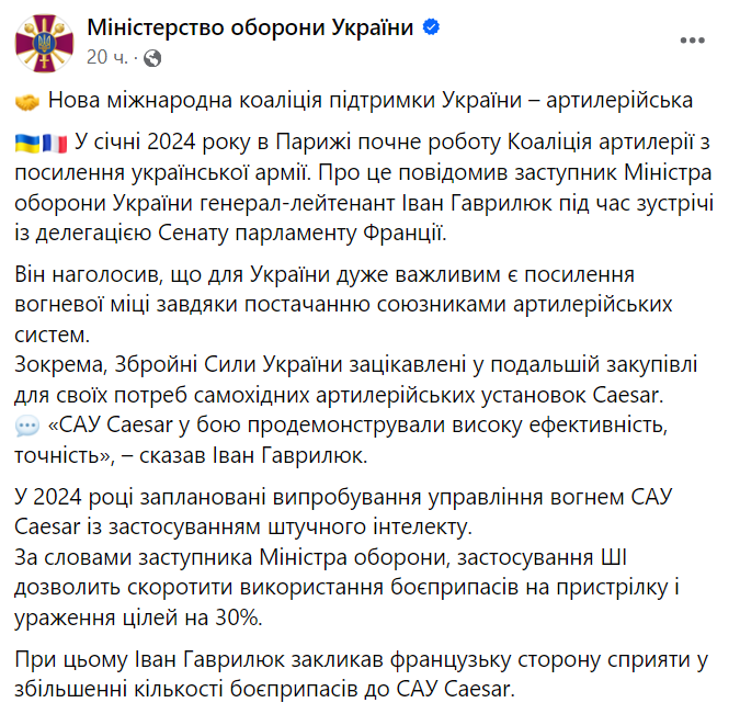 В январе 2024 года в Париже приступит к работе Коалиция артиллерии по усилению украинской армии.