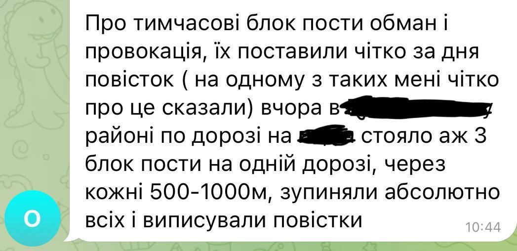 "О временных блокпостах - обман и провокация, их поставили четко ради повесток (на одном из таких мне четко об этом сказали). Вчера в районе по пути стояло сразу 3 блокпоста на одной дороге, через каждые 500-1000 м, останавливали абсолютно всех и выписывали повестки", - пишет читатель.