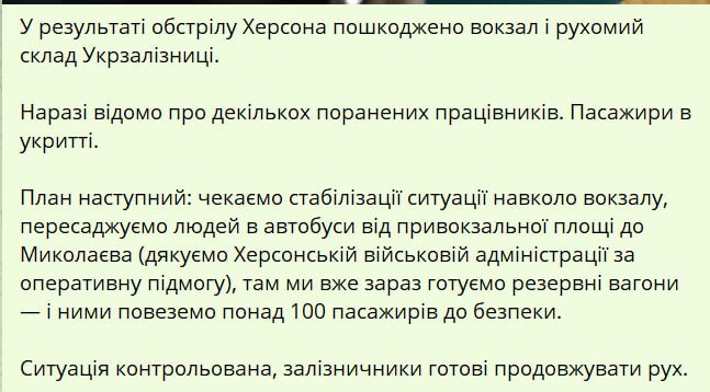 "Укрзализныця" подтвердила, что в результате обстрела Херсона повреждены вокзал и подвижной состав.