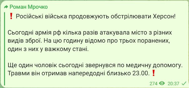 Сегодня сообщали, что в Херсонской области из-за российских обстрелов погибли два мирных жителя.