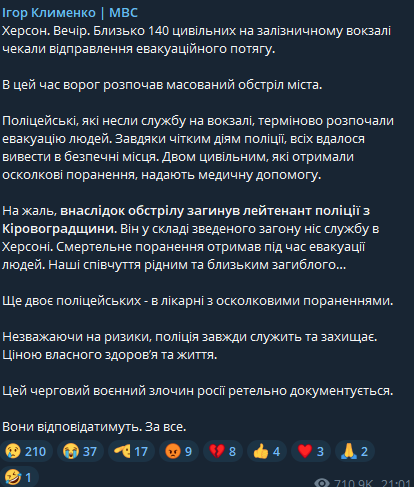 В результате обстрела ж/д вокзала в Херсоне погиб лейтенант полиции из Кировоградской области. Об этом сообщил глава МВД Игорь Клименко.