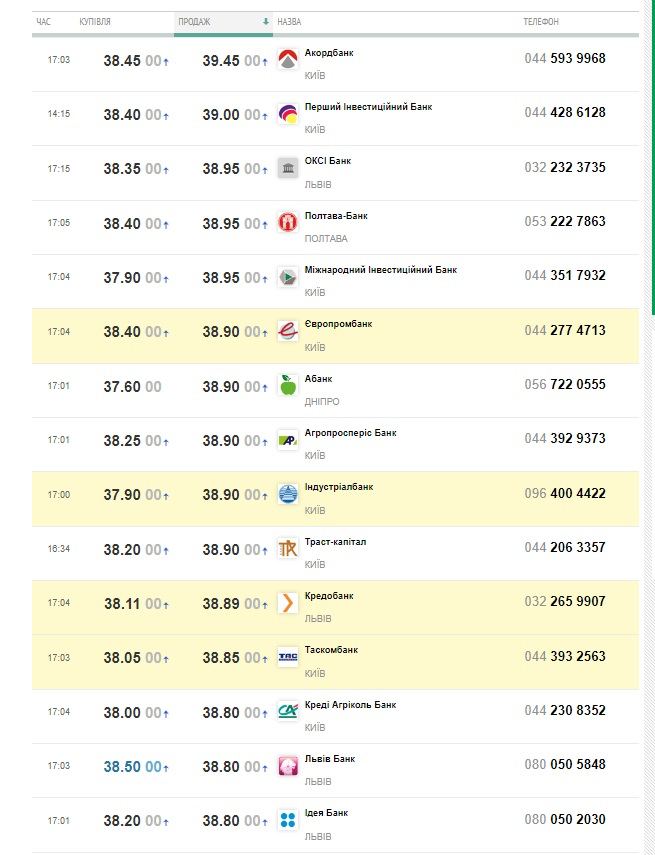 Наличный курс в кассах банков подскочил сразу на 25-30 копеек, и достиг 39,0 грн/$ (Первый инвестиционный банк) и 39,45 грн/$ (Аккордбанк) — это максимумы. А средние курсы продажи были в диапазоне 38,10-38,95 грн/$, покупки — 37,50-38,40 грн/$. Госбанки старались не завышать ценники: например, Приватбанк ставил покупку/продажу на 38,0-38,45 грн/$, а Ощадбанк — 37,95-38,40 грн/$.