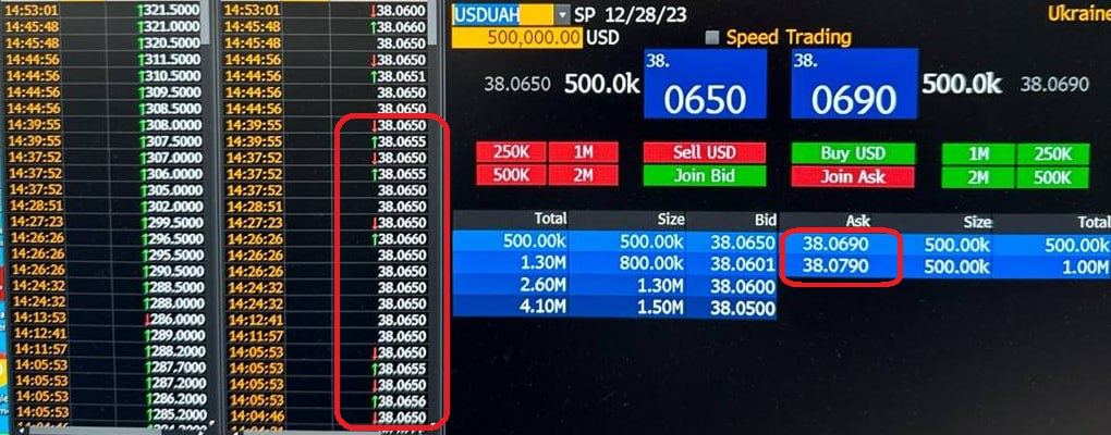 "Крупные валютные покупки сегодня фиксировались с самого утра - конец года, и многим импортерам нужно закрыть оплаты по контрактам 2023-го и сделать предоплаты на 2024-й. Это в Украине нет выходных, и 1 января, в понедельник, будет работать межбанк, но западные банки будут закрыты и партнерам украинских поставщиков важно закрыть сделки до конца недели. На валютном рынке присутствует сезонный фактор. Но одновременно ощущается и некоторый ажиотаж, после того как межбанк прошел 38-й курс. Импортеры стали активнее брать доллар, и банки для себя (на позицию), чтобы пополнить кассы долларом под растущий наличный спрос", — рассказал "Стране" директор казначейства одного из крупных банков.