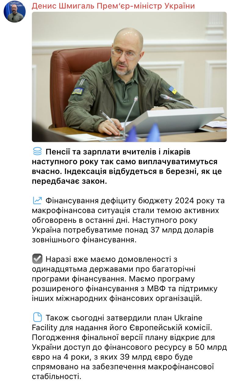 "Пенсии и зарплаты учителей и врачей в следующем году так же будут выплачиваться в срок. Индексация пройдет в марте, как это предусматривает закон. Финансирование дефицита бюджета 2024 г. и макрофинансовая ситуация стали темой активных обсуждений в последние дни. В следующем году Украина потребует более 37 млрд долларов внешнего финансирования. Сейчас уже есть договоренности с одиннадцатью государствами о многолетних программах финансирования. Есть программа расширенного финансирования с МВФ и поддержка других международных финансовых организаций", - сказано в посте главы Кабмина.