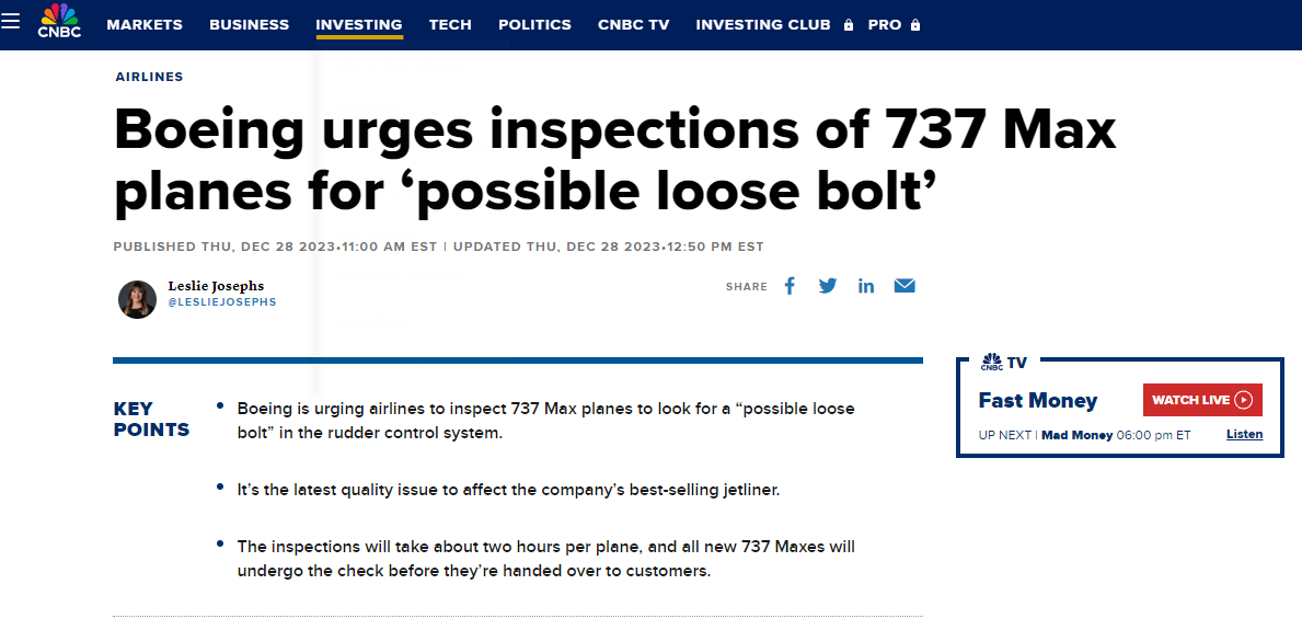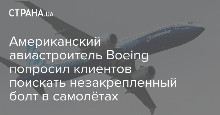 Авиастроитель Boeing призвал своих клиентов по всему миру провести проверку самолетов Boeing 737 Max на предмет наличия незакрепленного болта в конструкции.