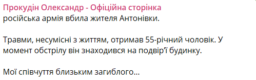 16:00 Сегодня днем армия РФ ударила по Антоновке Херсонской области. Погиб 55-летний мужчина.
