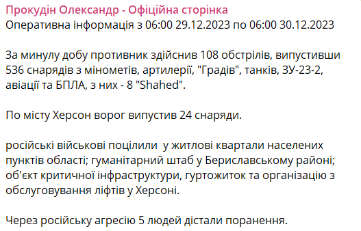 08:13 За минувшие сутки россияне совершили 108 обстрелов Херсонской области, выпустив 536 снарядов из минометов, артиллерии, "Градов", танков, ЗУ-23-2, авиации и БПЛА, из них – 8 "Shahed". По городу Херсон враг выпустил 24 снаряда.