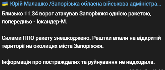 12:32 Под Запорожьем сегодня днем сбили ракету, сообщает ОВА.