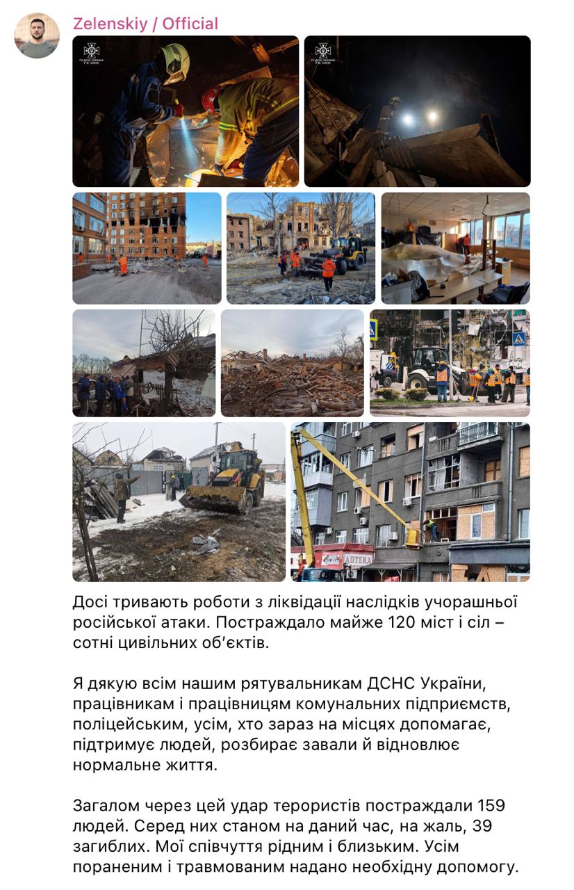 14:44 Президент Украины Владимир Зеленский заявил, что число жертв в результате вчерашней атаки достигло 39 человек. Еще 159 ранены.