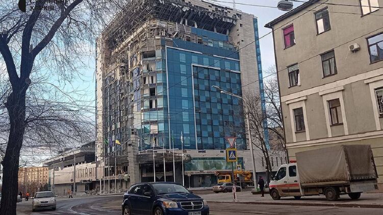 Россияне обстреляли гостиницу Kharkiv Palace на площади Свободы. Фото: Telegram