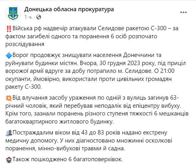"Враг продолжает уничтожать население Донбасса и разрушать дома горожан. Вчера, 30 декабря 2023 года, под прицел вражеской армии во второй раз за сутки попали г. Селидово. В 21:00 оккупанты, вероятно, использовали против гражданских людей ракету С-300" - говорится в сообщении.