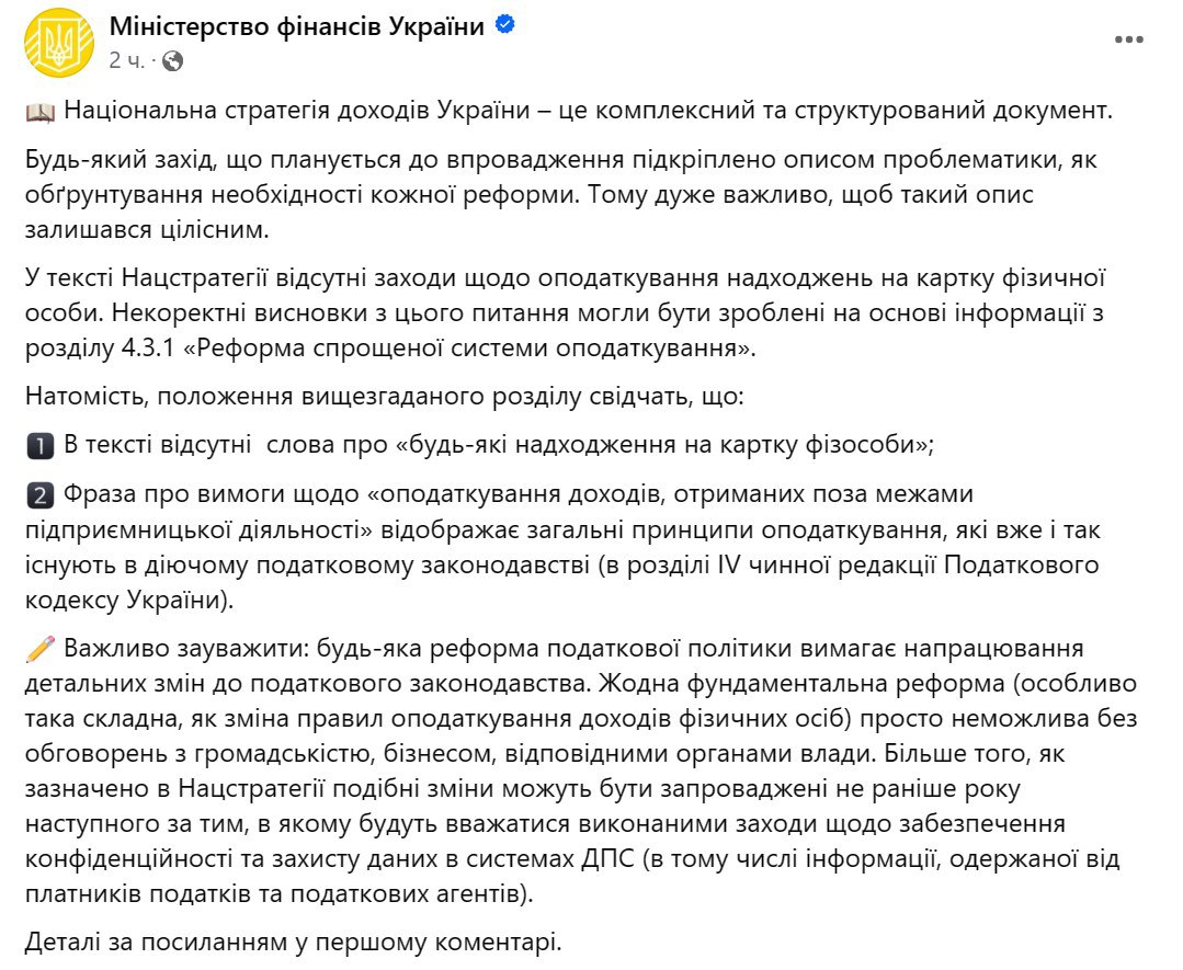 "В тексте Нацстратегии отсутствуют меры по налогообложению поступлений на карту физического лица", - заявили в Минфине.