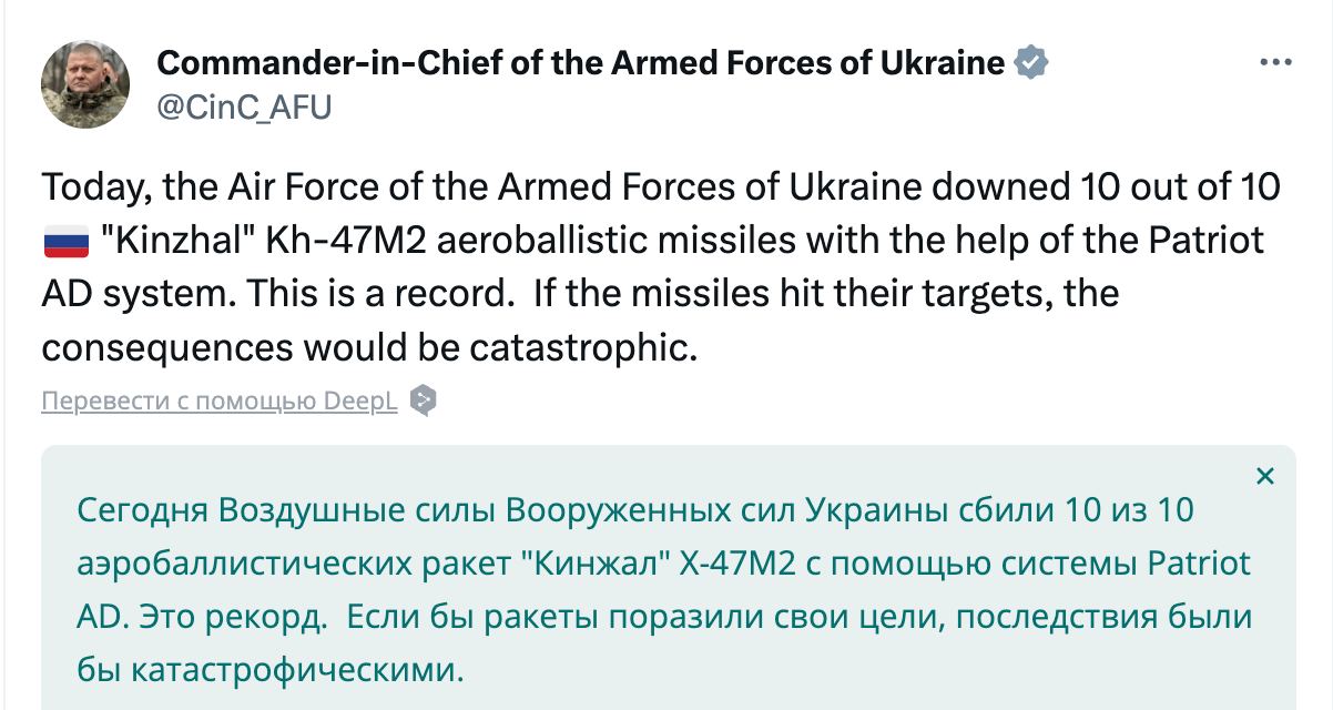 Возможен повторный пуск ракеты "Кинжал", пишут Воздушные силы.