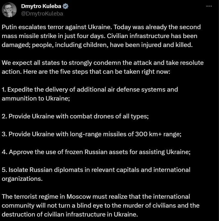 Министр иностранных дел Украины Дмитрий Кулеба призвал Запад ускорить поставку дополнительных систем ПВО и боеприпасов в Украину в ответ на утренний массированный обстрел.