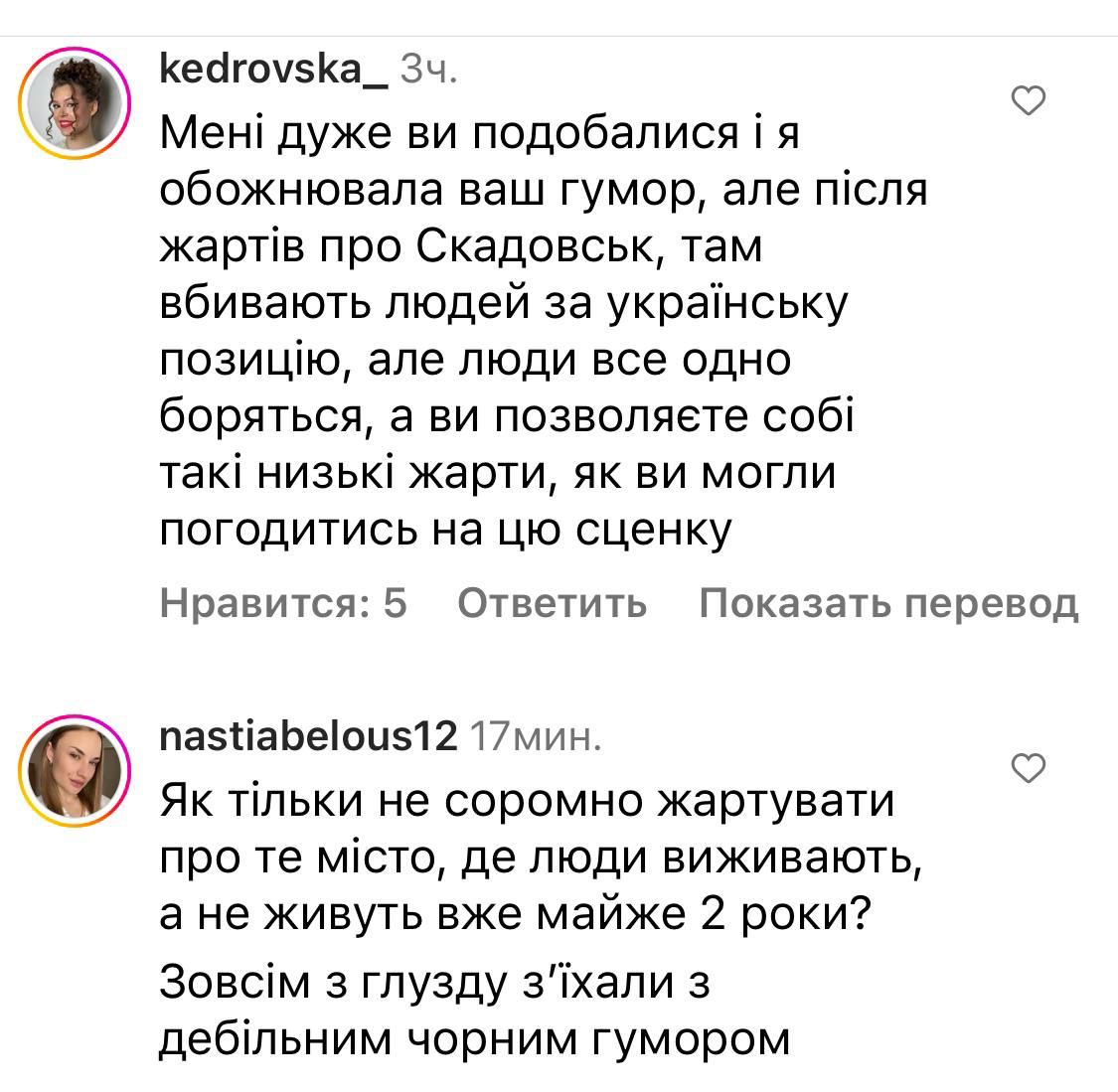 "Плюнули в душу"; "Я сама скадовчанка, впервые слышу, чтобы в Скадовске так разговаривали, для меня этот ролик очень оскорбительный. Я вас после этого просто ненавижу. Это вы так объединяете Украину? Стыдно за вас"; "Испанский стыд! Как так можно, в Скадовске очень красиво говорят на украинском, так и на русском тоже. Хочу знать авторов этого дерьма! Каждую фамилию хочу узнать!"; "Дно. Это ж какой гнилой личностью нужно быть, чтобы так неуважительно шутить о людях из оккупации", - пишут пользователи.