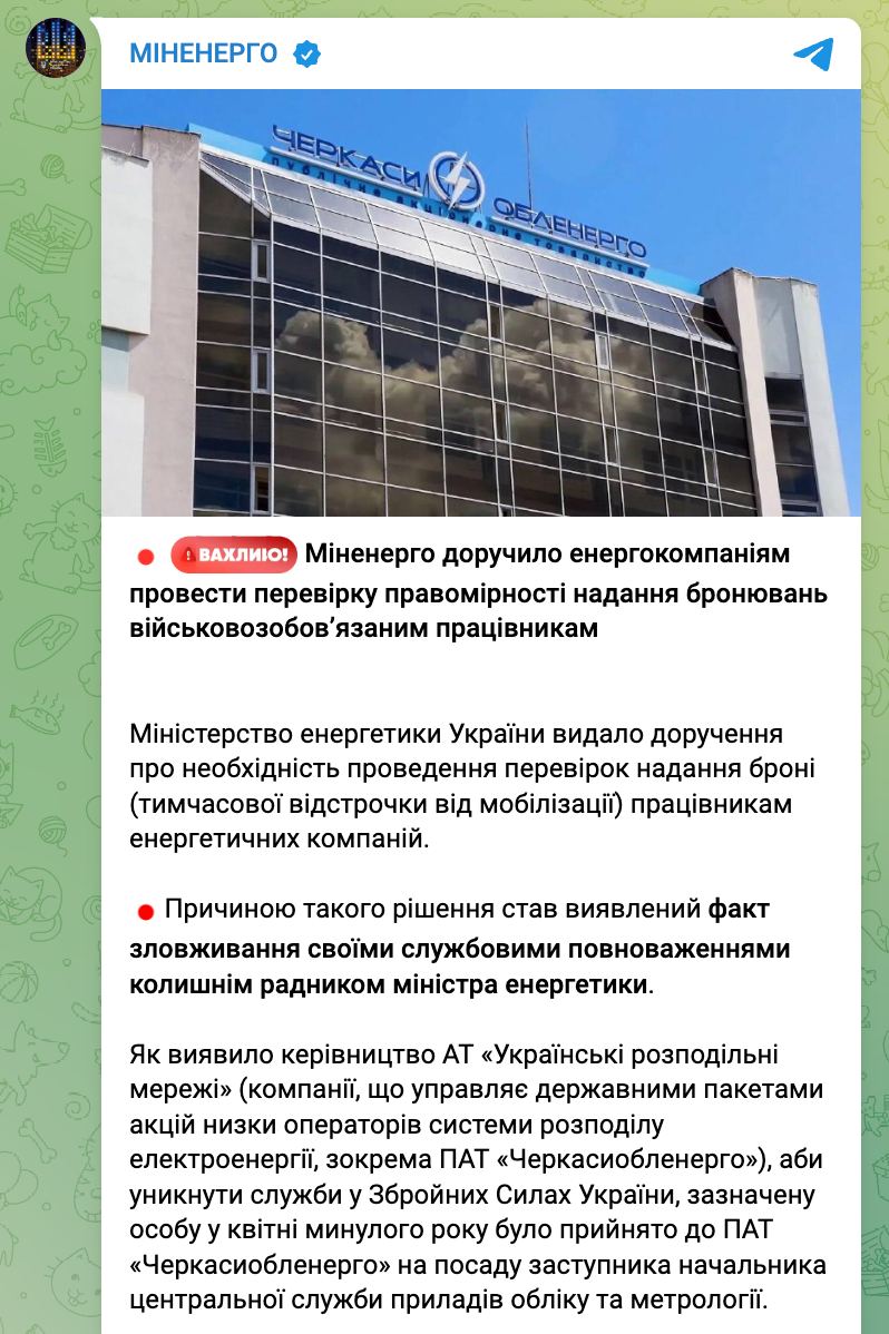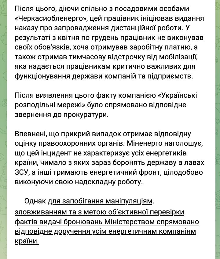 Был выявлен факт злоупотребления бывшим советником министра энергетики, которого для уклонения от службы зачислили на работу в "Черкассыоблэнерго", которую он игнорировал, получая зарплату.
