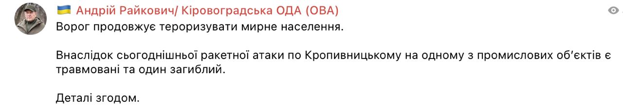 14.23 В результате утренней ракетной атаки по Кропивницкому поврежден энергетический объект "Укрэнерго", сообщает компания.