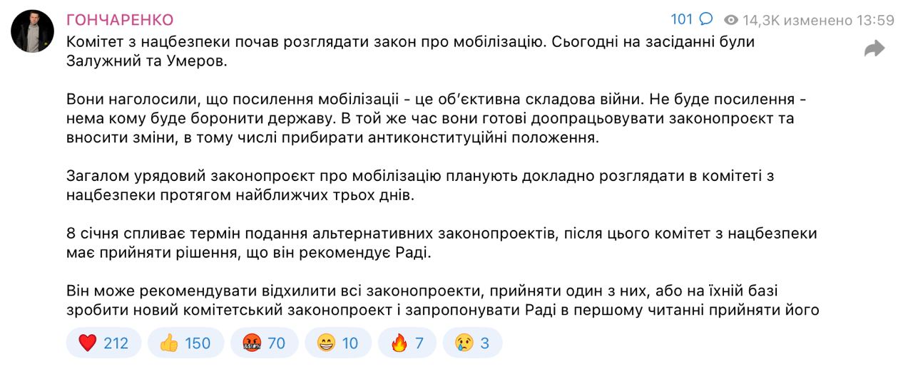 Об этом они сказали на парламентском комитете, где рассматривается законопроект о мобилизации, передает нардеп Гончаренко.