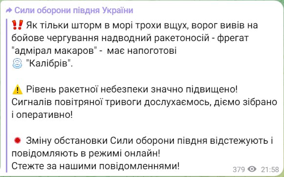 Ранее в Воздушных силах сообщили о движении ракет в направлении города.