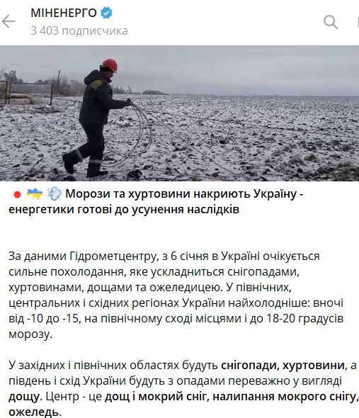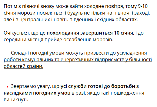 Похолодание, которое ожидается в Украине с 6 по 10 января, может "привести к усложнению" работы энергетических предприятий в большинстве областей страны.