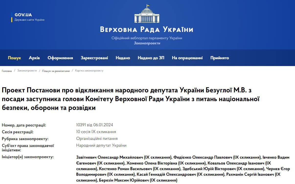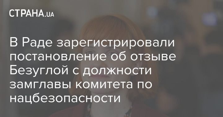В Верховной Раде зарегистрировали постановление об отзыве народного депутата Марьяны Безуглой с должности заместителя главы парламентского Комитета по нацбезопасности и обороне.