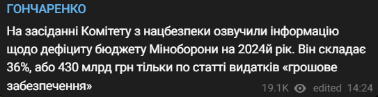 "Он составляет 36%, то есть 430 млрд грн. И это только по статье денежное обеспечение", - пишет Гончаренко.