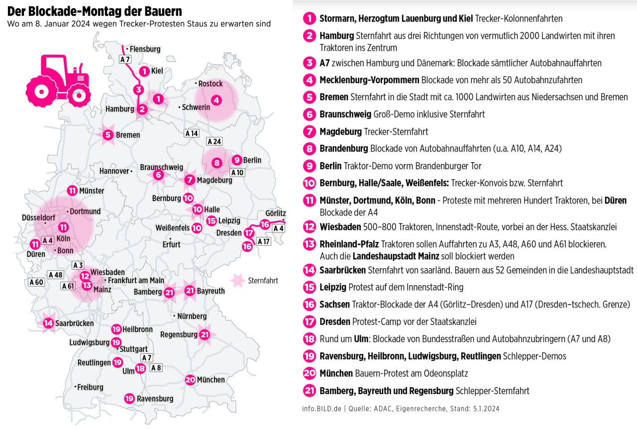 В связи с мероприятием ФРГ ожидает транспортный коллапс. О своем участии в нем заявили 3500 человек, она будет включать медленный проезд колонн сельскохозяйственных тракторов и грузовых автомобилей по трассам A14, A19, A20 и A24, блокировку въездов на автотрассы и автопробеги по крупным городам.