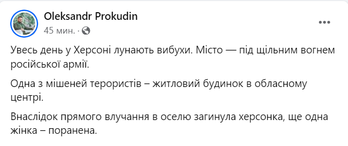 "Весь день в Херсоне раздаются взрывы. Город – под плотным огнем российской армии. Одна из мишеней террористов – жилой дом в областном центре.