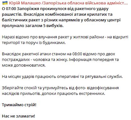 Утром 8 января власти Запорожья подтвердили ракетный удар по городу.