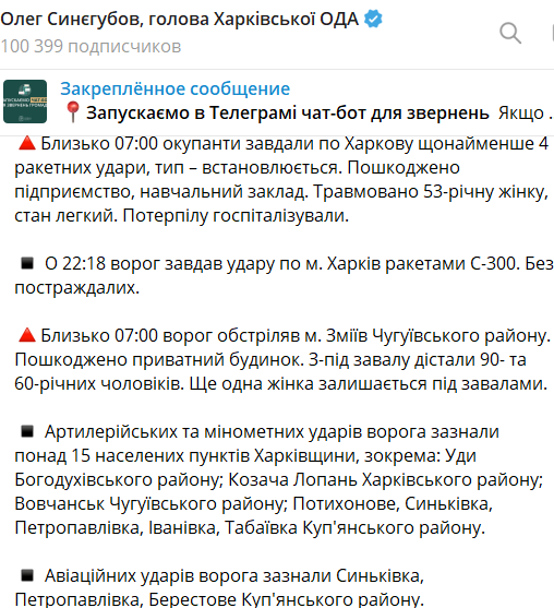 Об этом сообщил глава Харьковской областной военной администрации Олег Синегубов в своем телеграм-канале.